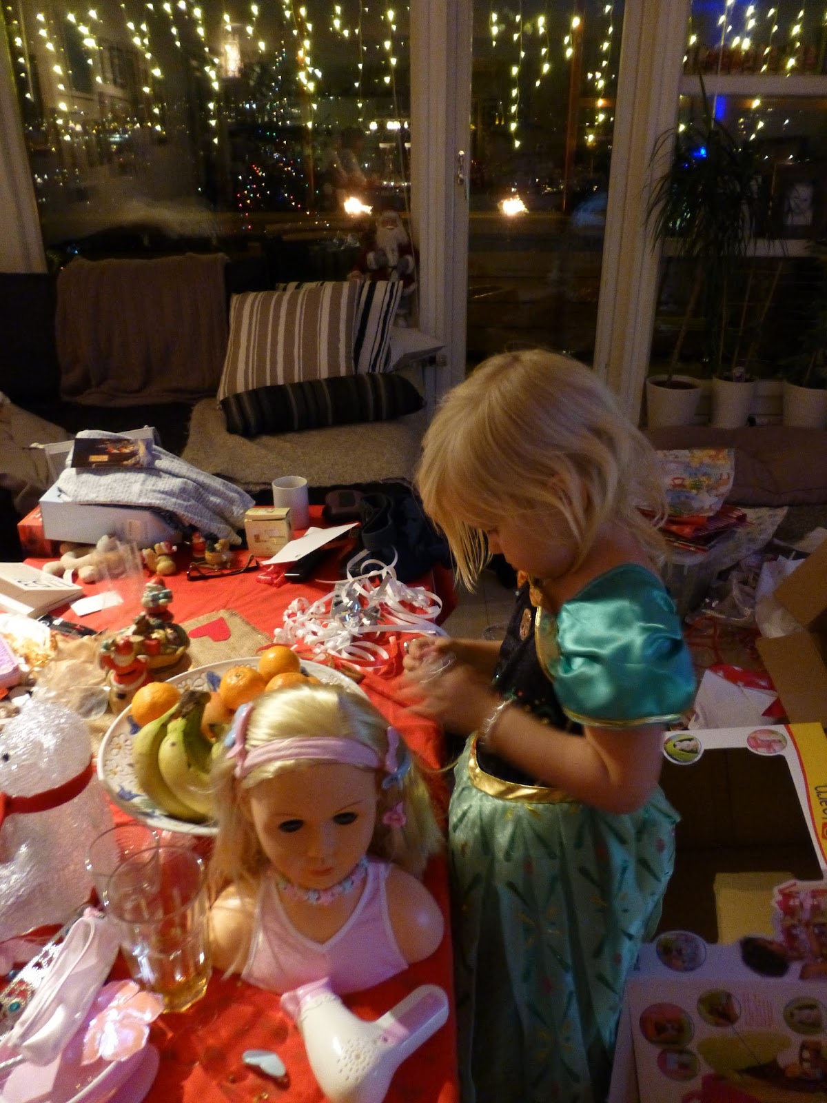Den store opp-pakking-kvelden. Vivel var mest opptatt med julepapir og bånd mens storesøster Marselie er pakke-henteren.